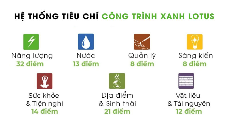 Năng lượng: Cần đạt mức tiết kiệm năng lượng tối thiểu 20% so với công trình tiêu chuẩn.