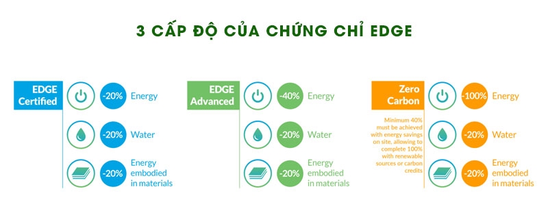 2. EDGE (Excellence in Design for Greater Efficiencies) EDGE là một hệ thống chứng nhận toàn cầu được phát triển bởi Tổ chức Tài chính Quốc tế (IFC), một thành viên của Ngân hàng Thế giới. EDGE tập trung vào việc giảm thiểu tài nguyên sử dụng, giúp các dự án đạt được mức hiệu quả cao về chi phí và tài nguyên.